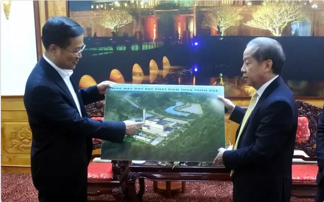 簽約儀式前,王天義總裁與潘玉壽主席就順化項目投資合作進行了坦誠友好的交流。王天義總裁表示,光大國際是亞洲最大的垃圾發(fā)電投資運營商,積累了世界一流的技術與管理經(jīng)驗,剛投產(chǎn)運營的芹苴項目為光大國際進一步開拓越南市場提供了寶貴的經(jīng)驗,我們對越南投資環(huán)境也充滿信心。我們有信心有能力將順化項目建設得更快更好,并不斷擴大在越南的投資合作,希望雙方加快合同個別細節(jié)談判,早日開工建設。潘玉壽主席對此表示完全贊同,并就順化項目提出兩點希望,一是希望光大國際將順化項目建成環(huán)境優(yōu)美、品質優(yōu)異的垃圾發(fā)電項目,二是希望雙方鼎力配合,加快項目建設進程,盡快實現(xiàn)投產(chǎn)運營。簽約儀式后,王天義總裁還向潘玉壽主席展示了順化項目設計效果圖。