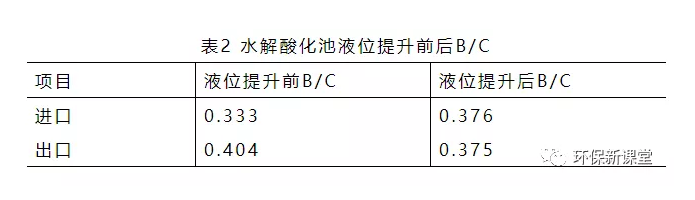 結(jié)合表2水解酸化池出水后B/C有一定的提高,在水解酸化池液位為提升前B/C由0.333提高到0.404,當(dāng)水解池液位提升后(停留時間增加0.2h)B/C由0.376降到0.375左右,說明停留時間增長,水解酸化池中消耗BOD5的微生物數(shù)量增多,反應(yīng)器向厭氧反應(yīng)的第三個階段進(jìn)行,對于后續(xù)的生化處理產(chǎn)生不良影響。