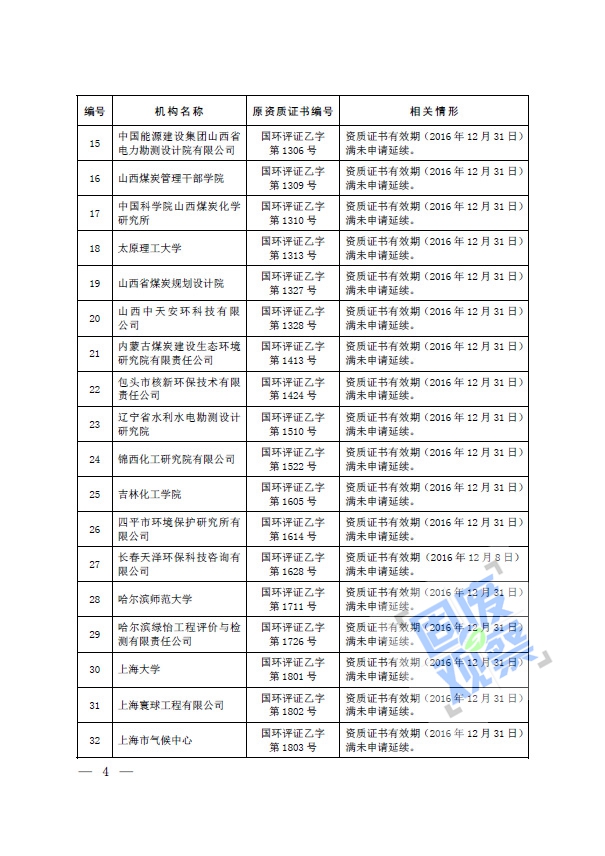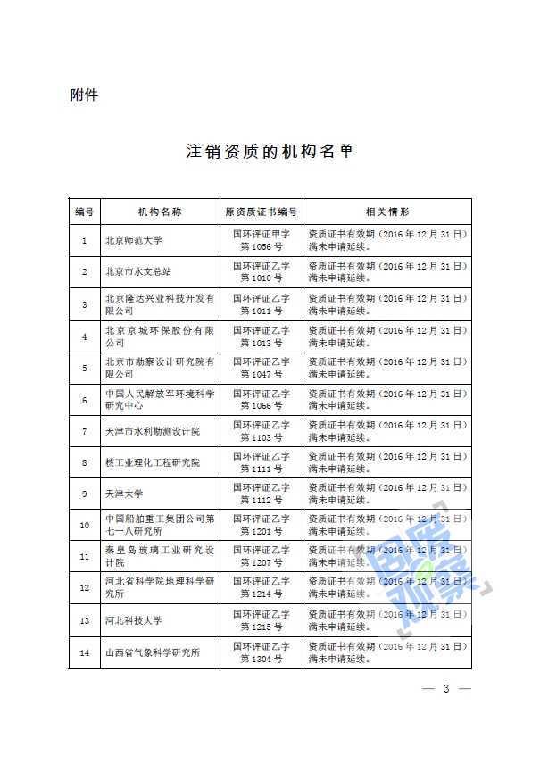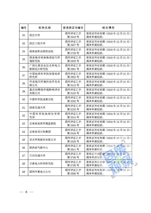 根據(jù)《建設(shè)項(xiàng)目環(huán)境影響評(píng)價(jià)資質(zhì)管理辦法》(環(huán)境保護(hù)部令第36號(hào))的有關(guān)規(guī)定,我部對(duì)建設(shè)項(xiàng)目環(huán)境影響評(píng)價(jià)資質(zhì)(以下簡(jiǎn)稱(chēng)資質(zhì))證書(shū)有效期滿(mǎn)未申請(qǐng)延續(xù)的69家機(jī)構(gòu)資質(zhì)予以注銷(xiāo)(具體名單詳見(jiàn)附件)。