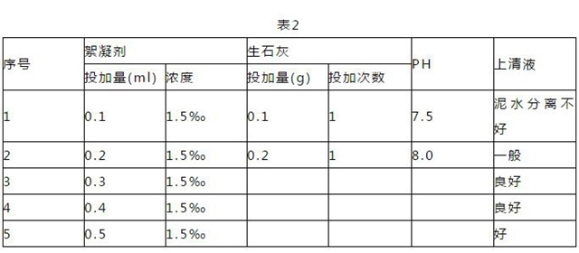 3月18日上午在專業(yè)人員的指導(dǎo)下,我們決定對2#氧化溝系列采用投生石灰和絮凝劑來控制氧化溝內(nèi)因污泥膨脹產(chǎn)生的褐色泡沫,投生石灰是為了殺死活性污泥中的絲狀菌(利用絲狀菌不能在堿性環(huán)境中生存的原理),投絮凝劑是為了增加活性污泥的沉降性能。首先做小試,確定生石灰和絮凝劑投加量,取2#氧化溝內(nèi)混合液1000ml,首加0.1g生石灰,測PH值為7.7,再加0.1g生石灰攪拌,測PH為8.03,小試后確定每升混合液中加0.2g生石灰,換算為每方0.2kg;然后向混合液中加1.5‰的絮凝劑從0.1ml開始加至0.5ml時,混合液的泥水分離較好,上清液變清亮,換算為每方混合液加1.5‰的絮凝劑0.5 kg。