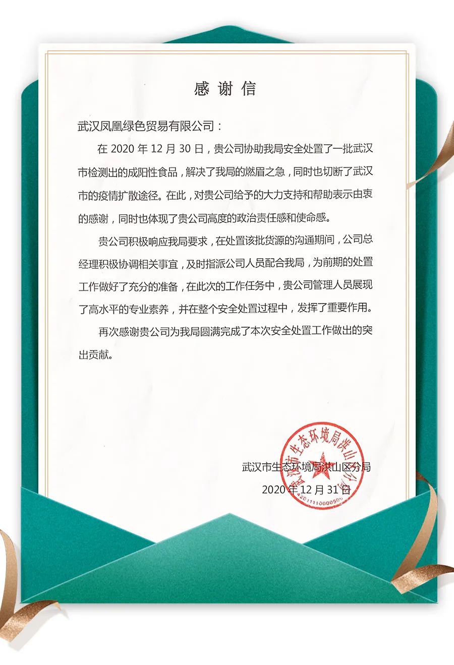 事后,武漢市生態(tài)環(huán)境局向武漢鳳凰項(xiàng)目發(fā)來(lái)感謝信,信中表示,在此次工作任務(wù)中,武漢鳳凰項(xiàng)目體現(xiàn)出了高度的政治責(zé)任感和使命感,展現(xiàn)出高水平的專業(yè)素養(yǎng),發(fā)揮了重要作用。