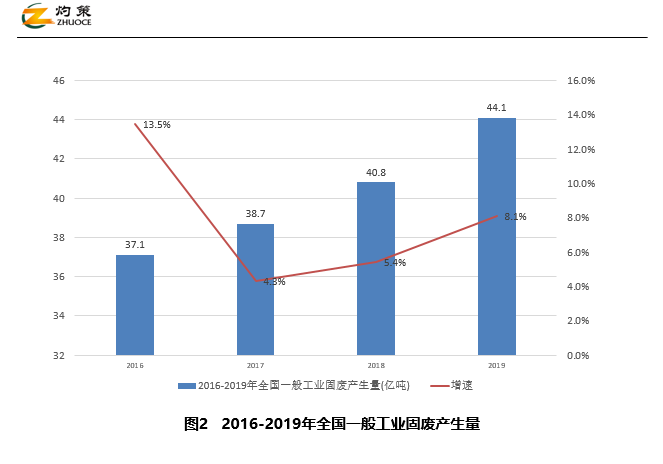 我國主要固體廢棄物中,一般工業(yè)固體廢棄物產生量最大。一般工業(yè)固體廢物,系指在工業(yè)生產活動中產生的除危險廢物之外的工業(yè)固體廢物。據(jù)《2016—2019年全國生態(tài)環(huán)境統(tǒng)計公報》,全國一般工業(yè)固體廢物產生量逐年上升,由2016年37.1億噸上升為2019年44.1億噸,上升了18.7%;一般工業(yè)固體廢物綜合利用量、處置量總體上升,2016 年分別為 21.1、8.5 億噸,2019 年分別為 23.2、11 億噸。