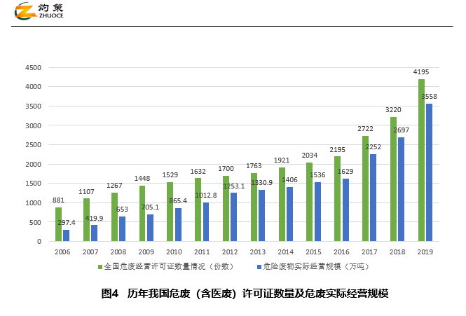 我國危廢處理行業(yè)的經營規(guī)模在逐年增長,據(jù)《年報》,截至2019年底,全國危險廢物許可證持證單位共4195個,同比增長30.3%。其核準收集和利用處置能力達到12896萬噸/年(含單獨收集能力1826萬噸/年);2019年度實際收集和利用處置量為3558萬噸(含單獨收集81萬噸)。與2006年相比,2019年危險廢物持證單位核準收集和利用處置能力、危險廢物實際收集和利用處置量分別增長1709%和1098%。