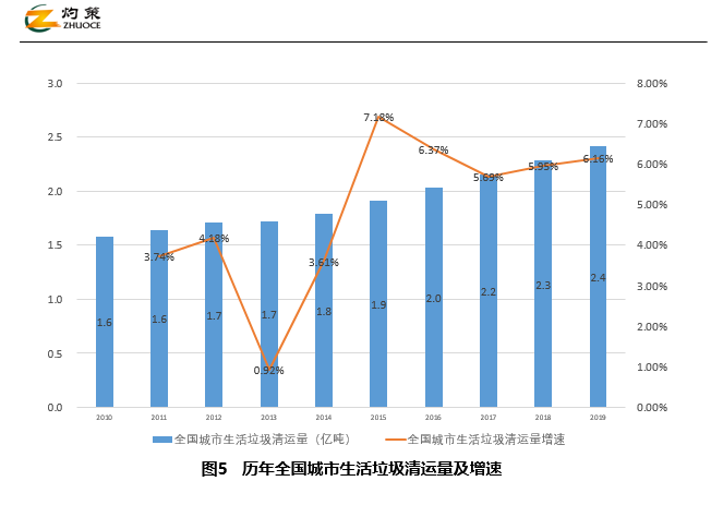 據(jù)統(tǒng)計,全國城市生活垃圾清運量持續(xù)增長,2019年達2.4億噸,按近四年平均6%左右的增速計算,預測2020年達2.6億噸,2025年達3.4億噸。