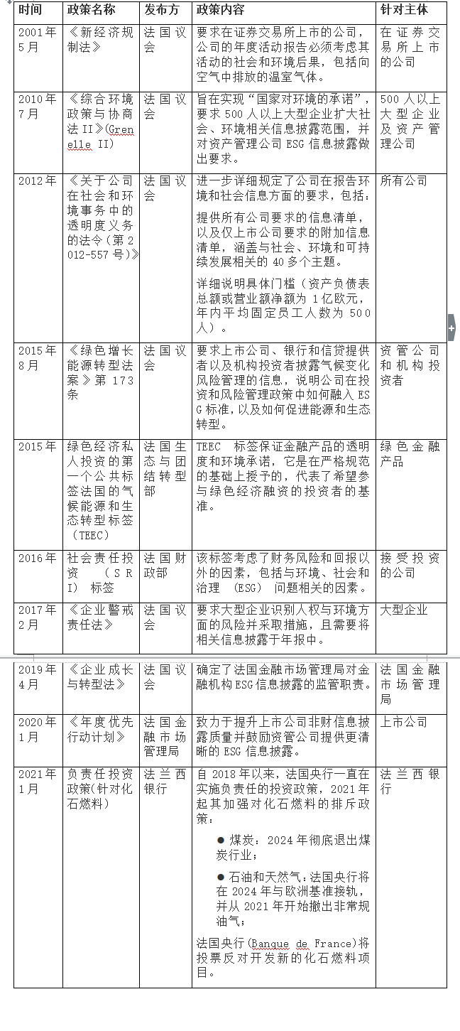 法國(guó)是全世界第一個(gè)將綠色金融納入法律范疇的國(guó)家。早在2001年,法國(guó)政府頒布新經(jīng)濟(jì)規(guī)制法案(NRE法案),啟動(dòng)強(qiáng)制性財(cái)務(wù)外報(bào)告,要求上市公司披露其活動(dòng)對(duì)環(huán)境和社會(huì)的影響。2010年的“Grenelle II 法案”第225條包含強(qiáng)制企業(yè)社會(huì)責(zé)任(CSR)信息披露的內(nèi)容,要求公司在年報(bào)中披露其環(huán)境及社會(huì)業(yè)績(jī)方面的信息。2012年,法國(guó)通過(guò)了關(guān)于公司在社會(huì)和環(huán)境事務(wù)中的透明度義務(wù)的法令(第2012-557號(hào)),進(jìn)一步詳細(xì)規(guī)定了公司在報(bào)告環(huán)境和社會(huì)信息方面的要求。對(duì)于法國(guó)金融界來(lái)說(shuō),《綠色增長(zhǎng)能源轉(zhuǎn)型法案》173條是最具影響力的法案,明確要求上市公司、銀行和信貸提供者以及機(jī)構(gòu)投資者(資產(chǎn)所有者和投資經(jīng)理)提高氣候變化相關(guān)風(fēng)險(xiǎn)的披露與透明度,該法案還包括與氣候相關(guān)金融信息披露工作組(TCFD)密切相關(guān)的措施,并要求法國(guó)當(dāng)局評(píng)估銀行業(yè)與氣候相關(guān)的風(fēng)險(xiǎn),法國(guó)成為世界上第一個(gè)對(duì)金融機(jī)構(gòu)提出ESG信息披露要求的主要經(jīng)濟(jì)體。2015年,法國(guó)生態(tài)與團(tuán)結(jié)轉(zhuǎn)型部發(fā)布了綠色經(jīng)濟(jì)私人投資的第一個(gè)公共標(biāo)簽——法國(guó)的氣候能源和生態(tài)轉(zhuǎn)型標(biāo)簽(TEEC),TEEC標(biāo)簽確保了金融產(chǎn)品的透明性和環(huán)保性,它授予條件嚴(yán)格,代表了參與綠色經(jīng)濟(jì)融資的投資者的要求。2016年,法國(guó)財(cái)政部提出了社會(huì)責(zé)任投資(SRI)標(biāo)簽,該標(biāo)簽考慮了財(cái)務(wù)風(fēng)險(xiǎn)和回報(bào)以外的因素,包括與環(huán)境、社會(huì)和治理(ESG)問(wèn)題相關(guān)的因素。2021年1月,法蘭西銀行針對(duì)自身投資發(fā)布了一項(xiàng)新的負(fù)責(zé)任投資政策,以加強(qiáng)其對(duì)化石燃料的排斥政策。據(jù)此,法蘭西銀行表示到2024年底,完全排除所有從事煤炭相關(guān)活動(dòng)的公司,無(wú)論規(guī)模如何;2024年與歐洲基準(zhǔn)保持一致,2021年開始退出開始撤出非常規(guī)油氣;投票反對(duì)開發(fā)新的化石燃料項(xiàng)目。2021年3月,法蘭西銀行成立了氣候變化中心,以監(jiān)測(cè)其與氣候變化相關(guān)的所有舉措并確保其協(xié)調(diào)。