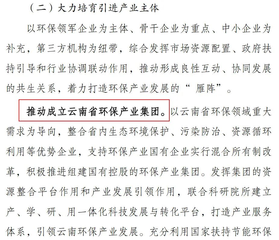不過,這個“福建省生態(tài)環(huán)保集團(tuán)”到底什么時候組建完成,其中都包括什么內(nèi)容,一切具體的信息就都不知道了。還有云南,今年7月,云南省發(fā)布《云南省“十四五”環(huán)保產(chǎn)業(yè)發(fā)展規(guī)劃(征求意見稿)》,其中提到,要推動成立云南省環(huán)保產(chǎn)業(yè)集團(tuán)。以云南省環(huán)保領(lǐng)域重大需求為導(dǎo)向,整合省內(nèi)生態(tài)環(huán)境保護(hù)、污染防治、資源循環(huán)利用等優(yōu)勢企業(yè),支持環(huán)保產(chǎn)業(yè)國有企業(yè)實行混合所有制改革,積極推進(jìn)組建國有控股的環(huán)保產(chǎn)業(yè)集團(tuán)。