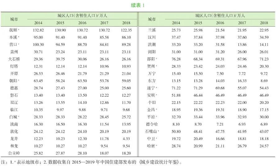 為了獲得收縮型城市的生活垃圾產(chǎn)生特征,首先對全國地級市、縣級市進(jìn)行了總體分析。收縮型城市目前還缺乏統(tǒng)一定義,本研究從生活垃圾管理角度出發(fā),根據(jù)我國《城鄉(xiāng)建設(shè)統(tǒng)計(jì)年鑒》,以城區(qū)人口(含城區(qū)暫住人口)在2013—2018年間持續(xù)減少超過5%為基本衡量依據(jù)。考慮到統(tǒng)計(jì)口徑的差異,進(jìn)一步參考各地的統(tǒng)計(jì)公報(bào)與年鑒,排除人口顯著流入的城市,得到典型收縮型城市共計(jì)49個(gè),如表1~表3所示。表1~表3中,有些地級市和縣級市為隸屬關(guān)系,但這些地級市的統(tǒng)計(jì)數(shù)據(jù)均對應(yīng)主城區(qū),并不包含下轄縣級市城區(qū)的人口或垃圾量。