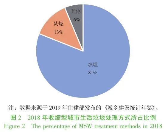 2)垃圾清運(yùn)量有增有減。我國大多數(shù)收縮型城市的經(jīng)濟(jì)仍在發(fā)展,這是與發(fā)達(dá)國家收縮型城市的一個(gè)顯著區(qū)別,但隨著人口數(shù)量的降低,垃圾清運(yùn)總量在不同程度地減少。然而,也有不少城市(例如大石橋、大慶、漢川等)的垃圾清運(yùn)量還在持續(xù)增加,這主要因?yàn)檫@些城市垃圾清運(yùn)服務(wù)的覆蓋范圍不斷擴(kuò)大,一些郊區(qū)、鄉(xiāng)鎮(zhèn)垃圾也納入到統(tǒng)一的清運(yùn)體系中。 3)人均垃圾清運(yùn)量較低。收縮型城市的垃圾清運(yùn)量基本代表了清運(yùn)服務(wù)覆蓋區(qū)域的垃圾產(chǎn)生量(僅少量可回收物未進(jìn)入清運(yùn)系統(tǒng))。收縮型城市的人均垃圾清運(yùn)量為(1.23±0.35)kg/d。值得注意的是,許多城市的垃圾清運(yùn)服務(wù)范圍不僅覆蓋城區(qū)人口,也覆蓋了郊區(qū)和部分鄉(xiāng)村地區(qū),因此人均清運(yùn)量數(shù)值偏高(城區(qū)人口少于垃圾清運(yùn)服務(wù)人口)。一些地級市的垃圾清運(yùn)量和城區(qū)人口有較好的對應(yīng)關(guān)系,其人均垃圾清運(yùn)量多在0.8~1.1 kg/d,低于發(fā)達(dá)城市。 4)垃圾處理以填埋為主。這49座城市清運(yùn)的生活垃圾基本實(shí)現(xiàn)了無害化處理,但處理以衛(wèi)生填埋方式為主,共有填埋場42座,而焚燒廠僅7座(主要在四川、江蘇),其他設(shè)施4座。從處理量上看,填埋方式也占約81%(圖2),比例顯著高于全國平均水平(40%),難以滿足可持續(xù)發(fā)展的要求。