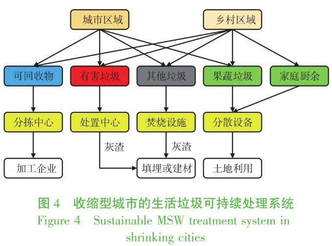 針對這一趨勢,收縮型城市生活垃圾管理應(yīng)采用更為靈活的策略,在鄉(xiāng)村地區(qū)重點(diǎn)開展廚余垃圾的就地利用,在城市地區(qū)生活垃圾分為可回收物、有害垃圾和其他垃圾,而將果蔬垃圾作為重點(diǎn)廚余垃圾管理,同時(shí)加強(qiáng)源頭減量和適度分散處理,構(gòu)建以焚燒為核心的彈性處理系統(tǒng)。