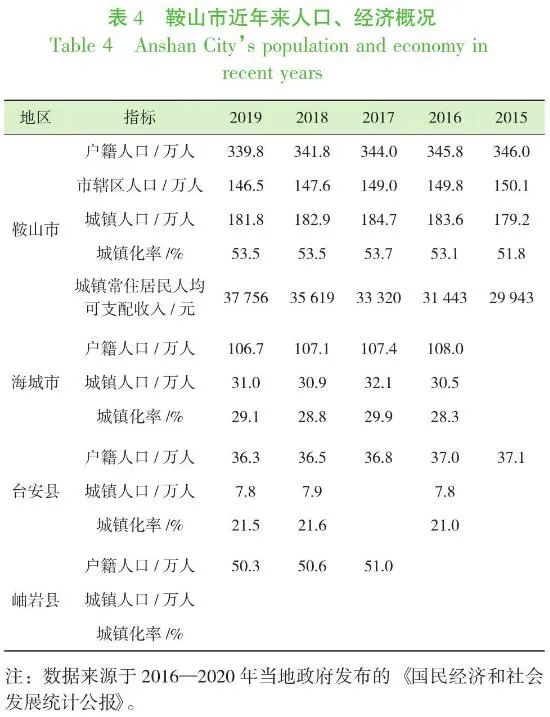 根據(jù)當(dāng)?shù)亟?jīng)濟(jì)和社會(huì)發(fā)展公報(bào)(表4),鞍山市的總戶籍人口和城鎮(zhèn)人口都呈現(xiàn)緩慢減少的趨勢,而城鎮(zhèn)化率近幾年保持在53%左右。在鞍山市內(nèi)部,存在鄉(xiāng)村人口逐漸向縣城(海城、臺(tái)安、岫巖)遷移,而縣城人口逐漸向鞍山市區(qū)遷移的趨勢。根據(jù)近幾年的趨勢,按戶籍人口每5 a減少2%估計(jì),則鞍山市2030年戶籍人口為326萬人,城鎮(zhèn)化率達(dá)到60%。