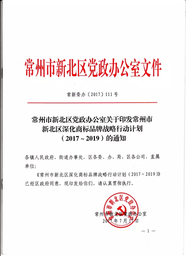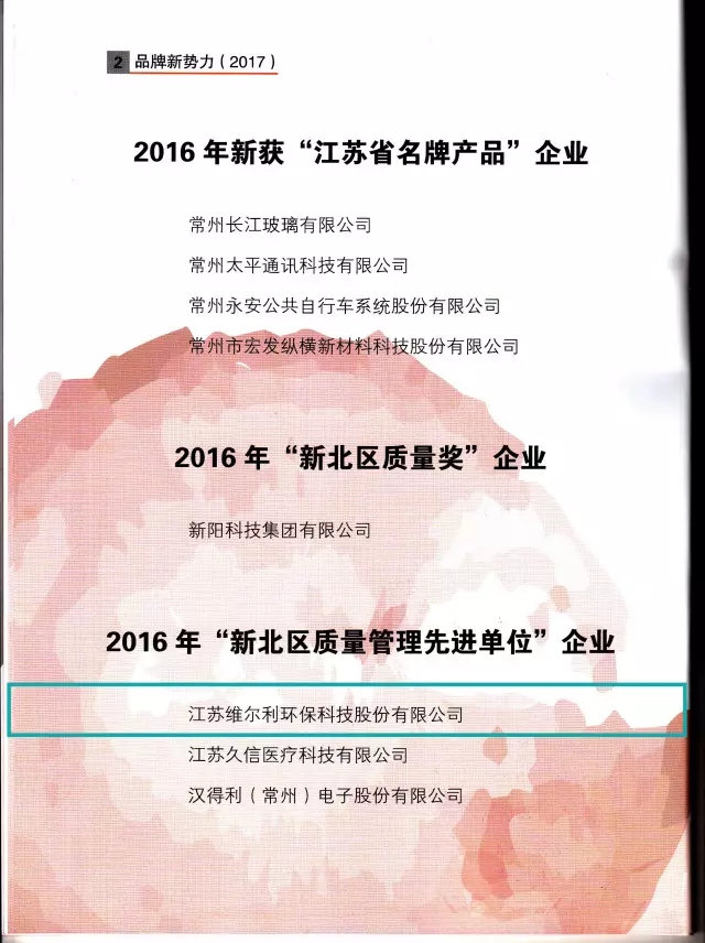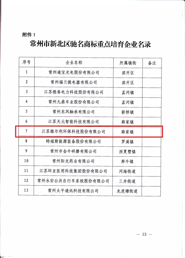 在《常州市新北區(qū)黨政辦公室關(guān)于印發(fā)常州市新北區(qū)深化商標(biāo)品牌戰(zhàn)略行動計劃(2017-2019)的通知》(常新委辦〔2017〕111號)文件中,提出深化商標(biāo)品牌戰(zhàn)略建設(shè),將維爾利環(huán)保作為常州市新北區(qū)馳名商標(biāo)重點培育企業(yè),實施“產(chǎn)業(yè)品牌提升”工程,打響產(chǎn)業(yè)品牌特色優(yōu)勢,培育細(xì)分行業(yè)新品牌。