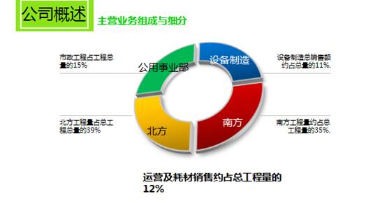 如上圖可見,紫科的主要業(yè)務(wù)細分為四大板塊,第一是設(shè)備制造,設(shè)備制造總銷售額約占總量的11%;第二是公用事業(yè)板塊,市政工程占工程總量的15%,在全國主要有兩個點。第一點在廣州總部,第二點在北京,這兩點一線負責(zé)全國市政的推廣;第三是北方板塊主要是工業(yè)板塊,總部在山東濰坊,是我們的全資子公司,北方工程量占總工程總量的39%;第四是南方板塊,總部在南京,南方工程量約占總工程量的35%。在運營和耗材的銷售,從2015年開始已經(jīng)占到總銷售額的12%。