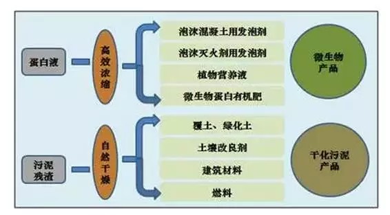 污泥經(jīng)水解處理后,其含蛋白液體經(jīng)濃縮后可作為蛋白發(fā)泡劑和有機(jī)肥等利用,污泥殘?jiān)捎米龈餐痢⒕G化土、土壤改良劑和建筑材料等。