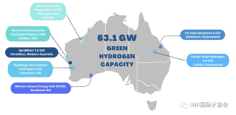 如下圖所示,澳洲計劃在東西海岸打造7個吉瓦級(GWh)的綠氫項目。此外,各地的污水廠已經(jīng)有實(shí)際的項目在測試或運(yùn)行中。