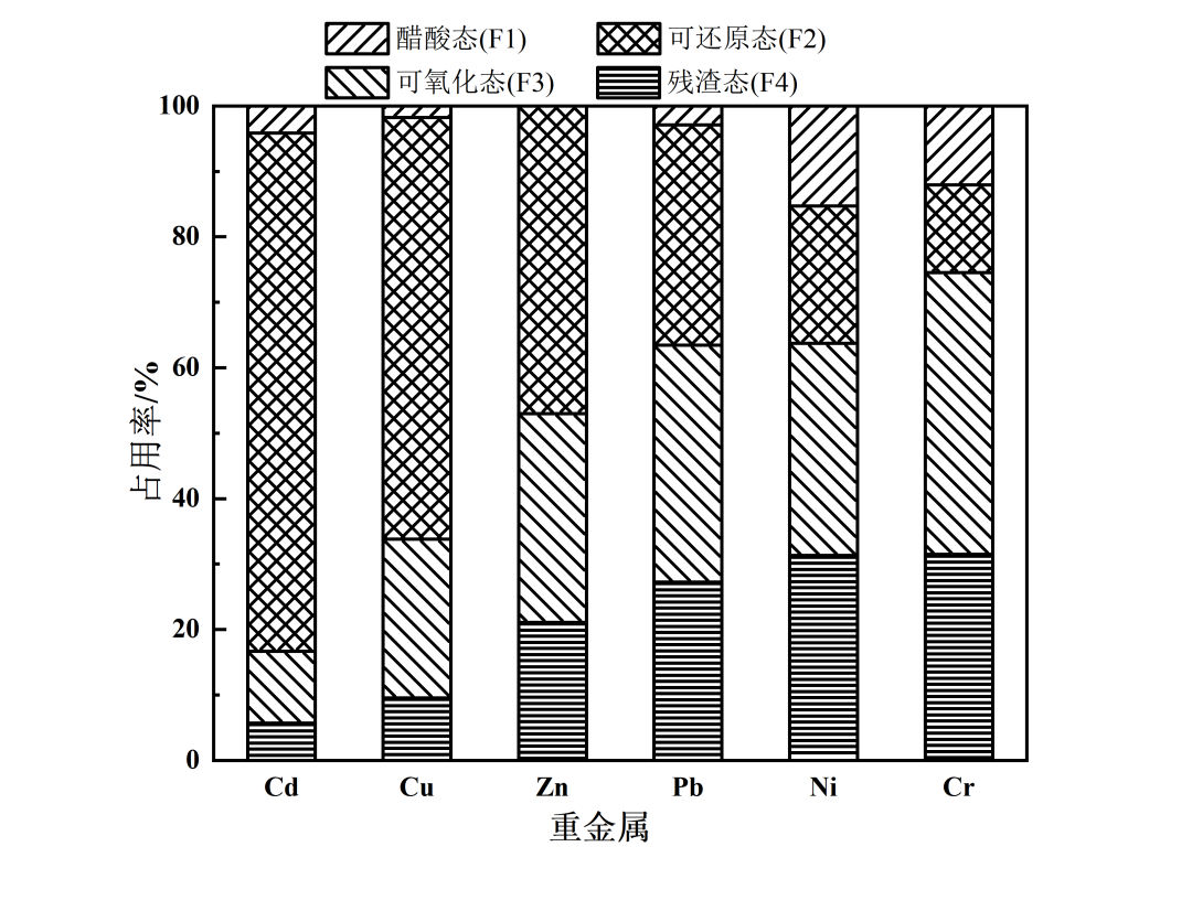 重金屬的生物有效性及潛在遷移性不僅與其總量有關(guān),還與其在飛灰中的賦存形態(tài)密切相關(guān),按照BCR分級提取法對焚燒飛灰中不同形態(tài)重金屬進行提取測定。BCR四步連續(xù)提取法將重金屬分為F1態(tài),主要含有水溶態(tài)、可交換態(tài)和碳酸鹽結(jié)合態(tài),在中性或弱酸性條件下易浸出;F2態(tài)主要是鐵錳氧化物結(jié)合態(tài),高活性的鐵錳氧化物比表面積大,對金屬離子有較大吸附容量,在還原條件下較易釋放;F3態(tài)包括有機物與硫化物結(jié)合態(tài),這一過程提取出來的重金屬,是被有機物或硫化物絡(luò)合的部分,在強氧化條件下可分解;F4態(tài)中元素主要與硅酸鹽礦物組合,在自然條件下性能穩(wěn)定,環(huán)境生態(tài)風(fēng)險較小。本研究飛灰中重金屬的不同賦存形態(tài)所占百分比如圖1所示。