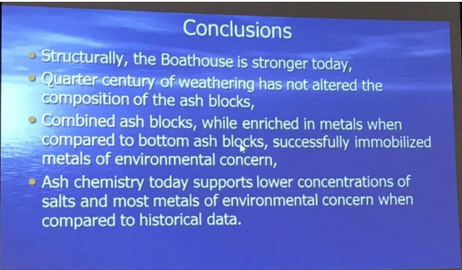 這位教授的演講題目很有趣,叫“船屋”。他講述了自己在年輕時(shí)候從垃圾焚燒廠弄回來(lái)一些垃圾灰制成的磚,用這些磚制作了一個(gè)小房間,這個(gè)小房間是用于存放他出去游玩的一艘小船的。為了檢驗(yàn)這些垃圾灰是否對(duì)人存在傷害,在這個(gè)幾十年中間,這位老教授會(huì)定期從墻上取樣分析這些灰的成分變化,并將這些數(shù)據(jù)展現(xiàn)在我們面前。