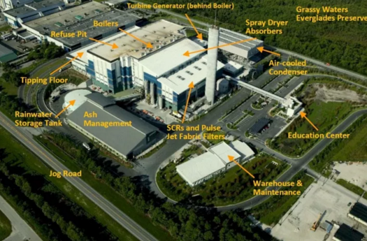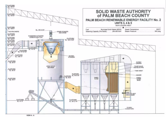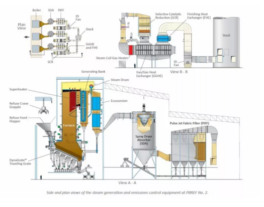 接下來(lái)說(shuō)重點(diǎn),介紹一下這個(gè)焚燒廠。全廠為3x1000t/d的偉倫爐排,煙氣工藝采用了SDA+布袋+GGH+SGH+SCR。該廠位于特朗普老家,而且離得不遠(yuǎn),是目前美國(guó)最先進(jìn)的焚燒廠,也是第一座采用SCR工藝的焚燒廠,2012年開(kāi)始建設(shè)至2015年投入商業(yè)運(yùn)行,隸屬于佛羅里達(dá)州海岸縣固廢管理局。