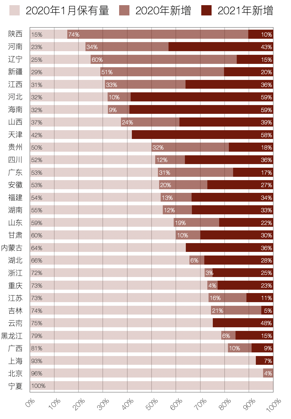 分省統(tǒng)計,陜西省、河南省、遼寧省、新疆維吾爾自治區(qū)、江西省、河北省、海南省、山西省、天津市僅2020年、2021年的增量占總處理能力的50%,即相對2019年,2年合計增幅超過100%,詳見圖2。