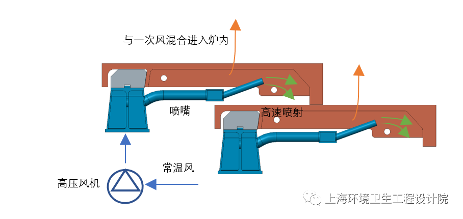 強制風冷依靠風管引入常溫高壓冷卻空氣,通過噴管高速吹掃爐排片高溫區(qū)域,局部溫度平均降低30℃~50℃,從而避免爐排片局部高溫燒損。上海環(huán)境院的風冷爐排系統(tǒng)如圖5所示,常溫空氣經(jīng)過高壓風機吹掃爐排片后與一次風混合進入焚燒爐參與燃燒,該設計不僅結構簡單,而且便于控制調(diào)節(jié),靈活可靠。
