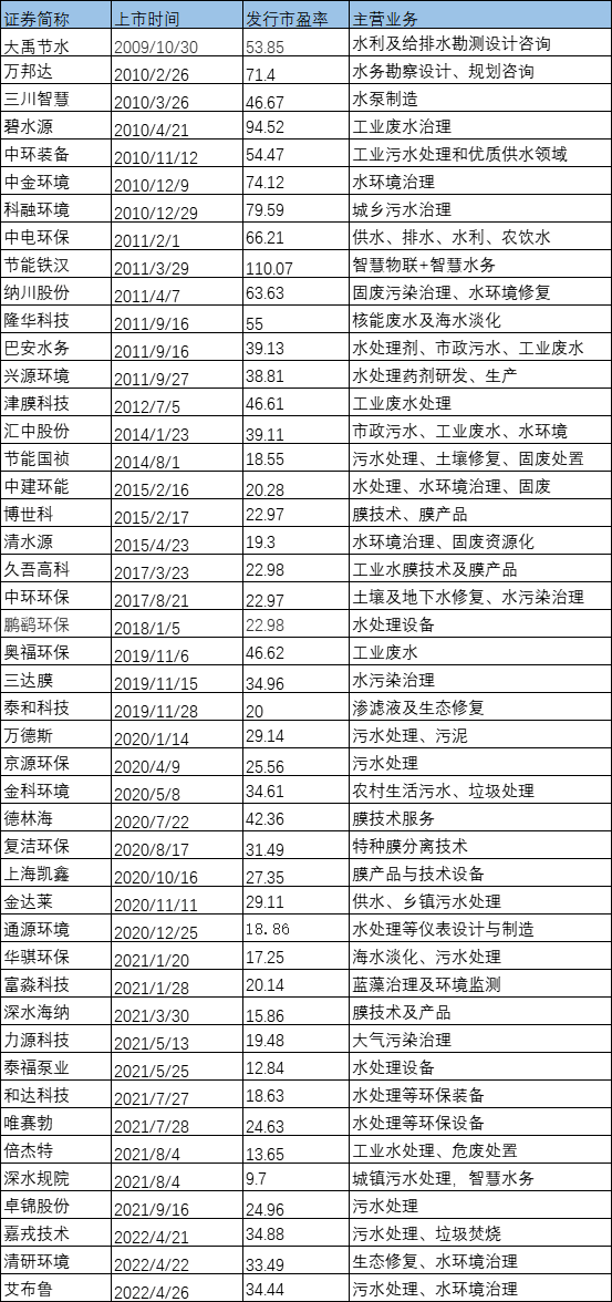 水務(wù)領(lǐng)域48家企業(yè)的平均發(fā)行市盈率則約為36.1,其中2019年之前上市的22家企業(yè)的平均發(fā)行市盈率約為49.24,2019后上市的26家企業(yè)的平均發(fā)行市盈率約為24.9。整體來(lái)看,從2009年到至今,水務(wù)企業(yè)的市盈率下降明顯,近乎腰斬,但今年貌似有所回升,新上市的3家企業(yè)的發(fā)行市盈率基本在34左右。