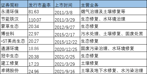 與整體市場(chǎng)的理性回歸相對(duì)應(yīng),環(huán)境監(jiān)測(cè)檢測(cè)和生態(tài)修復(fù)企業(yè)領(lǐng)域企業(yè)的發(fā)行市盈率也在近些年呈現(xiàn)出逐步降低的趨勢(shì)。