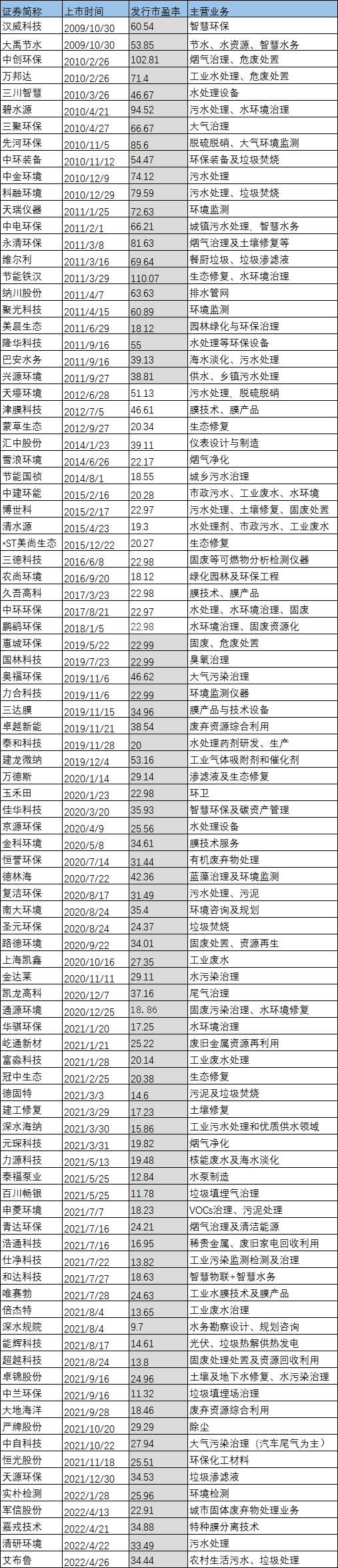 市盈率亦稱本益比,是股票價(jià)格除以每股盈利的比率。發(fā)行市盈率是指企業(yè)上市時(shí)股票發(fā)行價(jià)格與股票的每股收益的比例,可以用來(lái)反映資本對(duì)企業(yè)的價(jià)值判斷。一定程度上等同于大家俗稱的上市公司的PE值。發(fā)行市盈率高,在一定程度上反映了投資者對(duì)公司當(dāng)前價(jià)值和發(fā)展?jié)摿Φ恼J(rèn)同。這里作者試著從發(fā)行市盈率角度,看看這些年資本對(duì)環(huán)保企業(yè)的態(tài)度變化。