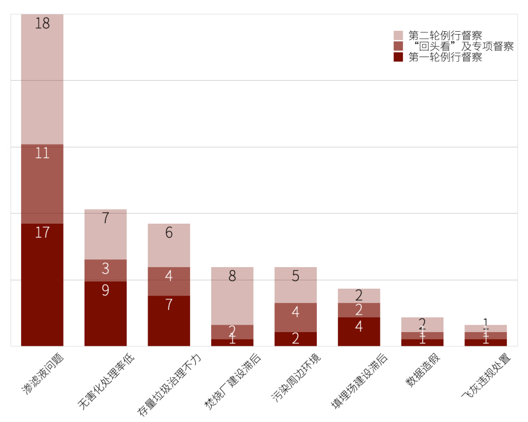 中央環(huán)保督察作為中國生態(tài)文明建設(shè)的一項重大制度創(chuàng)新,是落實環(huán)境保護“黨政同責”“一崗雙責”主體責任的重要舉措,具有代表中央權(quán)威、剛性約束、公眾參與、持續(xù)追蹤等特征。2015年開始至2022年6月,中央環(huán)保督察組共完成了2輪針對31個省區(qū)市的例行督察和1輪針對20個省區(qū)市的“回頭看”及專項督察,其中“生活垃圾”作為與公眾生活息息相關(guān)的議題,在中央環(huán)保督察工作組向各省區(qū)市反饋督察情況時頻繁出現(xiàn),個別嚴重問題因整改不力被公眾反復舉報。統(tǒng)計發(fā)現(xiàn),82份反饋意見中有60份涉及生活垃圾問題,分類統(tǒng)計歸納為兩大類22個小項共包含161次生活垃圾問題(部分省份的單份反饋意見中同時包括多個不同的生活垃圾問題),其中滲濾液違規(guī)處理問題最為突出、飛灰違規(guī)處置等問題反復出現(xiàn)、焚燒廠建設(shè)滯后等階段性出現(xiàn)。中央環(huán)保督察源自2015年7月中央全面深化改革領(lǐng)導小組第十四次會議,會議審議通過《環(huán)境保護督察方案(試行)》,也標志著中央生態(tài)環(huán)境保護督察制度(原中央環(huán)境保護督察,一般稱中央環(huán)保督察)正式建立。