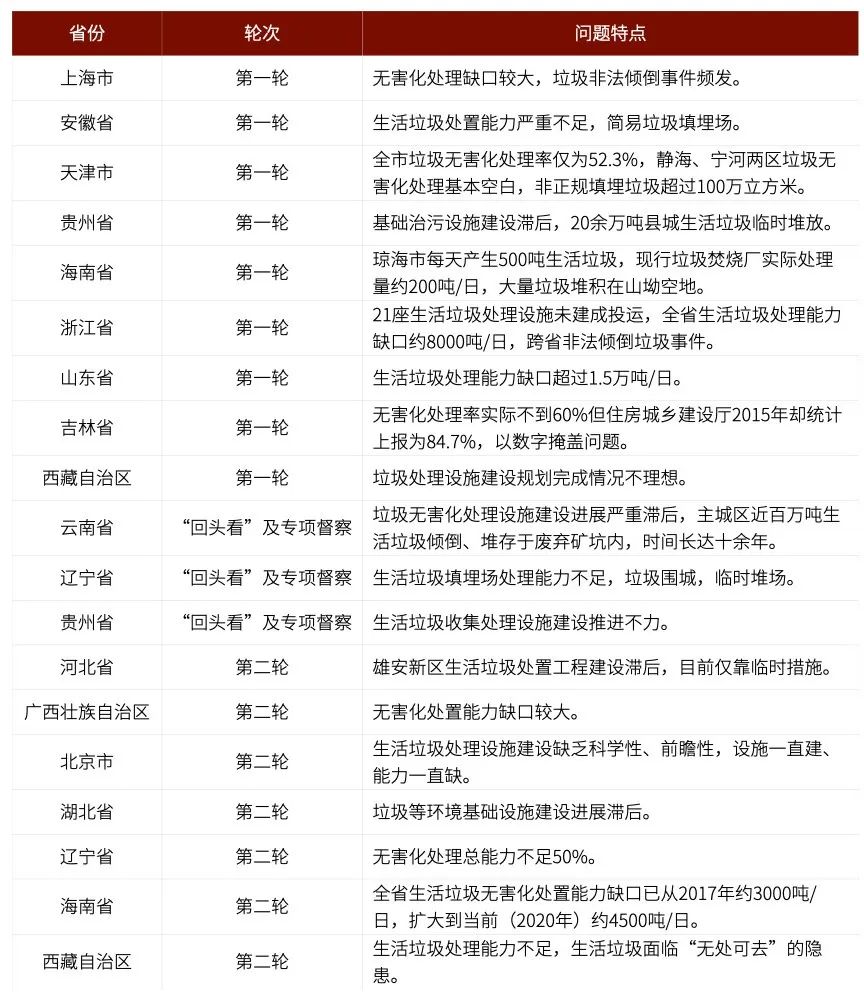 個別省區(qū)市歷史上無害化處理率低、無害化處理能力不足問題嚴重。其中,山東省在第一輪例行督察中被中央環(huán)保督察組反饋“生活垃圾處理能力缺口超過1.5萬噸/日”、云南省在“回頭看”及專項督察中被反饋“垃圾無害化處理設(shè)施建設(shè)進展嚴重滯后,主城區(qū)近百萬噸生活垃圾傾倒、堆存于廢棄礦坑內(nèi),時間長達十余年”、北京市第二輪例行督察被反饋“生活垃圾處理設(shè)施建設(shè)缺乏科學性、前瞻性,設(shè)施一直建、能力一直缺”等。具體情況詳見表1。