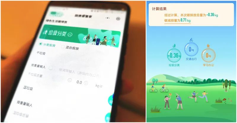 比如分類投放了5千克干垃圾、5千克濕垃圾、5千克塑料、5千克玻璃后,碳排放總量為-12.31千克,而混合投放20千克垃圾的碳排放總量為7千克,因此碳減排量為19.31千克。