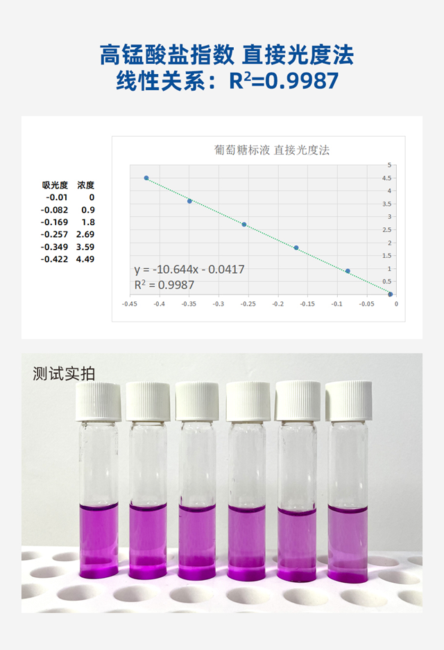 其中還有少量不溶于水的二氧化錳影響檢測結果,經過處理后,吸光度和高錳酸鹽指數(shù)濃度形成較好的線性關系,由此可忽略副反應消耗的高錳酸鉀,不影響最終結果的檢測。線性關系可達 R²=0.9995,顯著優(yōu)于市場主流的3種光度法的線性關系 R²=0.9987,檢測結果與國標滴定法無顯著差異。