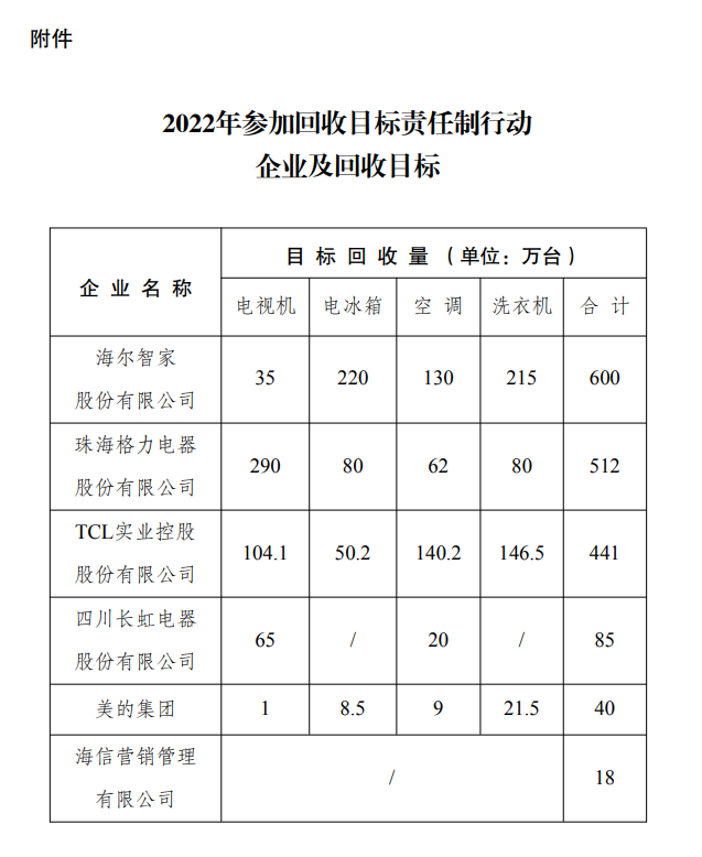 2022年5月,國(guó)家發(fā)展改革委辦公廳、工業(yè)和信息化部辦公廳、生態(tài)環(huán)境部辦公廳印發(fā)《關(guān)于做好2022年家電生產(chǎn)企業(yè)回收目標(biāo)責(zé)任制行動(dòng)有關(guān)工作的通知》,確定了6家開展2022年回收目標(biāo)責(zé)任制行動(dòng)的企業(yè)(見附件)。