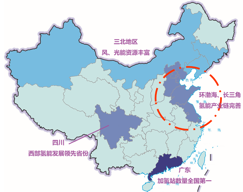 中國目前雖然是世界第一大產(chǎn)氫國,但各地氫能資源配置并不相同:能穩(wěn)定制取綠氫的風(fēng)、光電在三北地區(qū),水電在西南地區(qū);工業(yè)副產(chǎn)制氫零散遍布;而氫能產(chǎn)業(yè)基地集中在中東南地區(qū)。
