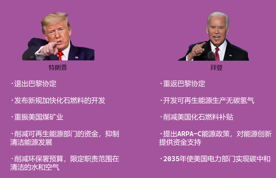 美國是“反復(fù)橫跳派”代表。一朝天子一朝臣的特色下,在國際上:反復(fù)“退群”氣候協(xié)定。在其國內(nèi):利好新能源的政策和利好化石能源的政策頻繁“兩極反轉(zhuǎn)”,地區(qū)和企業(yè)之間互相拉幫結(jié)派,整個能源產(chǎn)業(yè)難以協(xié)同作戰(zhàn)。