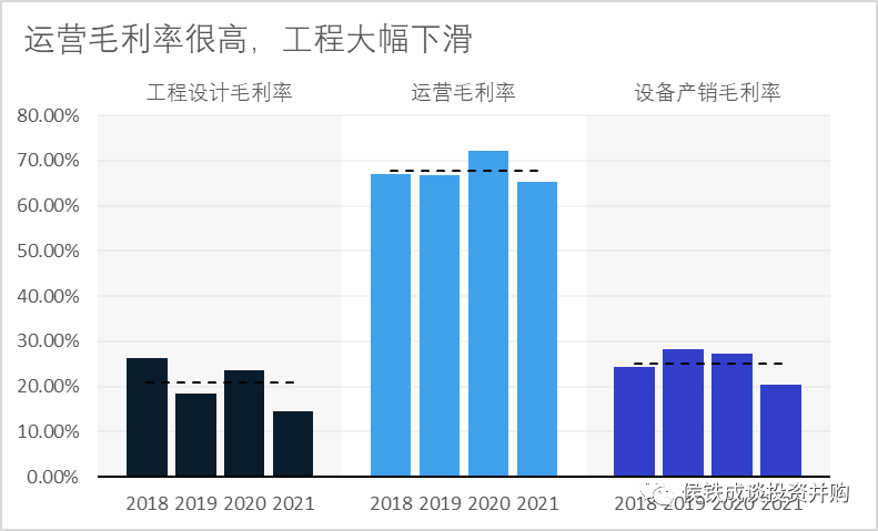 我們再看下各板塊的毛利,工程的收入規(guī)模雖大,但毛利極低。而運營板塊是其核心資產(chǎn)。這個也好理解,一般而言工程業(yè)務輕資產(chǎn),毛利率雖然很低,但凈資產(chǎn)收益率不低。運營板塊很多都是重資產(chǎn),凈資產(chǎn)收益率可能很低。