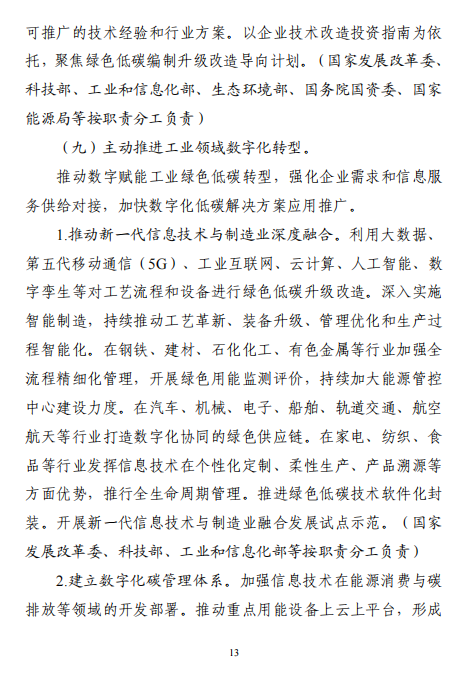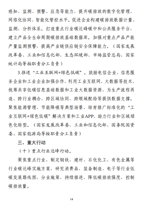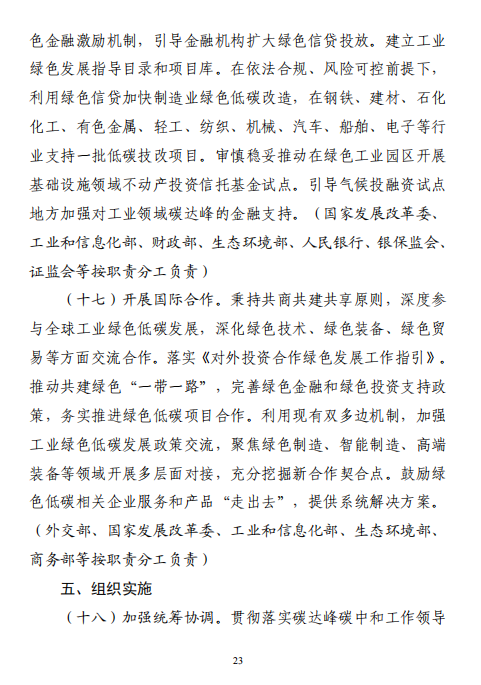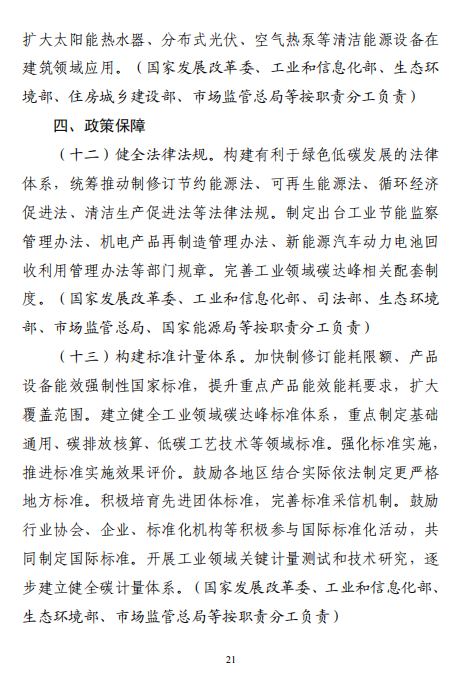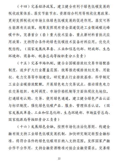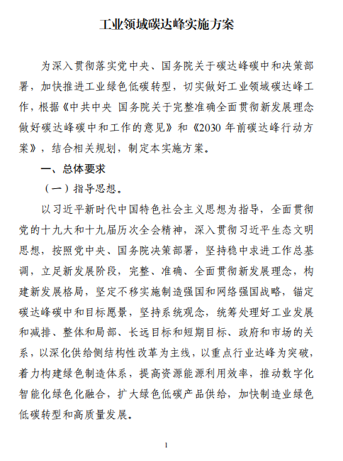 工業(yè)和信息化部 國(guó)家發(fā)展改革委 生態(tài)環(huán)境部關(guān)于印發(fā)工業(yè)領(lǐng)域碳達(dá)峰實(shí)施方案的通知工信部聯(lián)節(jié)〔2022〕88號(hào)外交部、科技部、司法部、財(cái)政部、住房城鄉(xiāng)建設(shè)部、交通運(yùn)輸部、商務(wù)部、人民銀行、國(guó)資委、稅務(wù)總局、市場(chǎng)監(jiān)管總局、統(tǒng)計(jì)局、銀保監(jiān)會(huì)、證監(jiān)會(huì)、能源局、林草局、郵政局,各省、自治區(qū)、直轄市及計(jì)劃單列市、新疆生產(chǎn)建設(shè)兵團(tuán)工業(yè)和信息化主管部門(mén)、發(fā)展改革委、生態(tài)環(huán)境廳(局):《工業(yè)領(lǐng)域碳達(dá)峰實(shí)施方案》已經(jīng)碳達(dá)峰碳中和工作領(lǐng)導(dǎo)小組審議通過(guò),現(xiàn)印發(fā)給你們,請(qǐng)認(rèn)真貫徹落實(shí)。