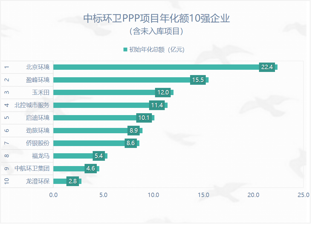 在337個(gè)已開(kāi)標(biāo)環(huán)衛(wèi)PPP項(xiàng)目中,北京環(huán)境已中標(biāo)環(huán)衛(wèi)PPP項(xiàng)目年化總額超過(guò)22億元(按初始年化額計(jì)算),排名第一,占全部已開(kāi)標(biāo)環(huán)衛(wèi)PPP項(xiàng)目年化總額的13%。