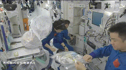 航天員陳冬將食品包裝袋放到垃圾袋里