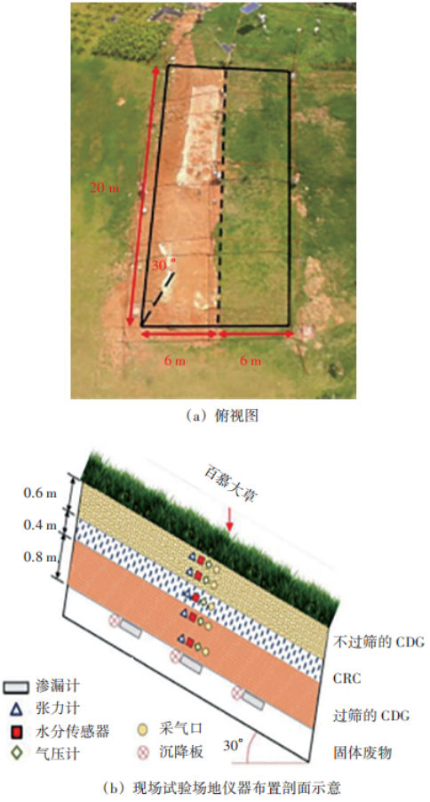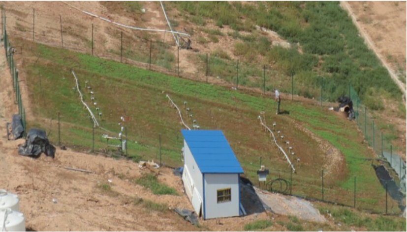 香港科技大學吳宏偉教授團隊于2016 年在深圳下坪生活垃圾填埋場二期西段建設了全天候3層覆蓋層試驗區(qū),如圖9所示,其中一半覆蓋層試驗區(qū)種植百慕大草,另一半作為參照組,坡面不種植任何植物,并由無紡土工布覆蓋,以防止降雨期間地表侵蝕。該覆蓋層坡度為30°,經(jīng)受深圳數(shù)次強臺風暴雨依然穩(wěn)定,有效提升了填埋場庫容。為驗證3層土質(zhì)覆蓋層的防滲性能,對覆蓋層試驗場進行了長達54個月的監(jiān)測,包括降雨量、覆蓋層滲漏量、孔隙水壓力及含水量變化等?,F(xiàn)場監(jiān)測數(shù)據(jù)表明,無膜的全天候3層覆蓋層在濕潤區(qū)年均滲漏量低于北美濕潤區(qū)覆蓋層設計標準。