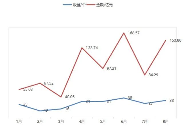據(jù)環(huán)衛(wèi)科技網(wǎng)統(tǒng)計(jì),8月,全國(guó)共開(kāi)標(biāo)了33個(gè)億級(jí)環(huán)衛(wèi)項(xiàng)目,合計(jì)中標(biāo)金額153.80億元。當(dāng)月億級(jí)環(huán)衛(wèi)項(xiàng)目開(kāi)標(biāo)數(shù)量和金額僅次于6月份,是今年第二高的月份。