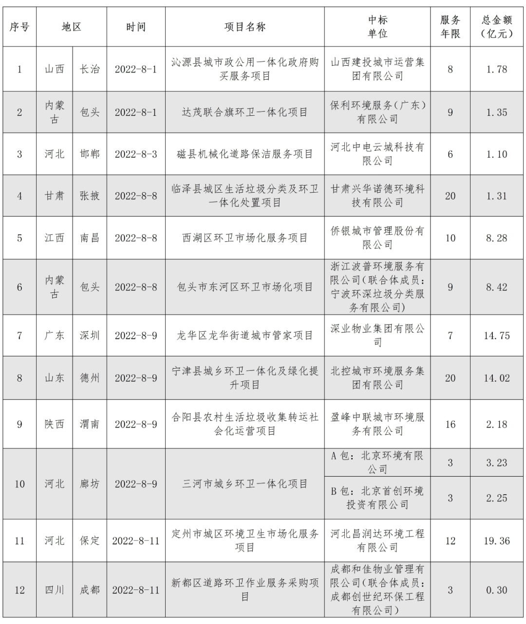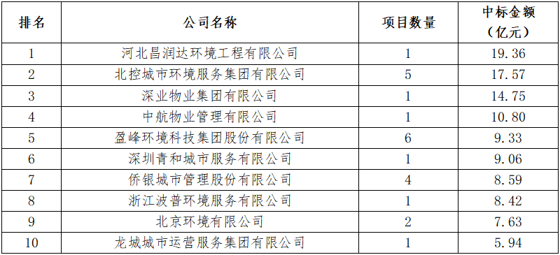 8月,河北昌潤(rùn)達(dá)環(huán)境工程有限公司憑借19.36億元的定州市城區(qū)環(huán)境衛(wèi)生市場(chǎng)化服務(wù)項(xiàng)目登頂企業(yè)月度排行榜榜首。定州市城區(qū)環(huán)境衛(wèi)生市場(chǎng)化服務(wù)項(xiàng)目特許經(jīng)營(yíng)期12年。服務(wù)范圍為河北省定州市市區(qū)西城、北城、南城、長(zhǎng)安辦、經(jīng)濟(jì)開(kāi)發(fā)區(qū)及高速高鐵站主次干道、小街巷、商業(yè)街區(qū)、便民市場(chǎng)和市區(qū)水域,清掃保潔總面積9617672.66平方米,項(xiàng)目負(fù)責(zé)公共區(qū)域生活垃圾(不含物業(yè)小區(qū)其他垃圾)產(chǎn)生量每天200~260噸。昌潤(rùn)達(dá)以1.61億元/年的投標(biāo)報(bào)價(jià)位中標(biāo)該項(xiàng)目。昌潤(rùn)達(dá)成立于2014年8月,位于保定市國(guó)家大學(xué)科技園8號(hào)樓,是河北省首批成立的一家集垃圾分類、城鄉(xiāng)環(huán)衛(wèi)一體化、公用設(shè)施管理維護(hù)、農(nóng)村廁改與吸污處理、智慧環(huán)衛(wèi)等多位一體的科技型環(huán)衛(wèi)一體化大型集團(tuán),系中國(guó)清潔服務(wù)行業(yè)百?gòu)?qiáng)企業(yè)。昌潤(rùn)達(dá)是一家典型的立足本土的環(huán)衛(wèi)企業(yè),其服務(wù)區(qū)域主要集中在保定市及周邊縣、區(qū)和邯鄲市部分縣鄉(xiāng)村。2021年8月,知名物企佳兆業(yè)美好曾宣布擬以3.67億元的價(jià)格收購(gòu)昌潤(rùn)達(dá)70%的股權(quán),但最終因“公司經(jīng)營(yíng)策略調(diào)整”,交易在年底告吹。從今年中標(biāo)的項(xiàng)目來(lái)看,昌潤(rùn)達(dá)似乎還沒(méi)有準(zhǔn)備走出河北,依舊在深耕自己的“一畝三分地”。● 北控城市環(huán)境連下五城,全年項(xiàng)目金額超48億元8月,北控城市環(huán)境迎來(lái)一波拿標(biāo)高潮,連續(xù)中標(biāo)5個(gè)環(huán)衛(wèi)項(xiàng)目,合計(jì)中標(biāo)金額達(dá)17.57億元,一舉拿下榜眼位置。表2 北控城市環(huán)境8月中標(biāo)項(xiàng)目匯總