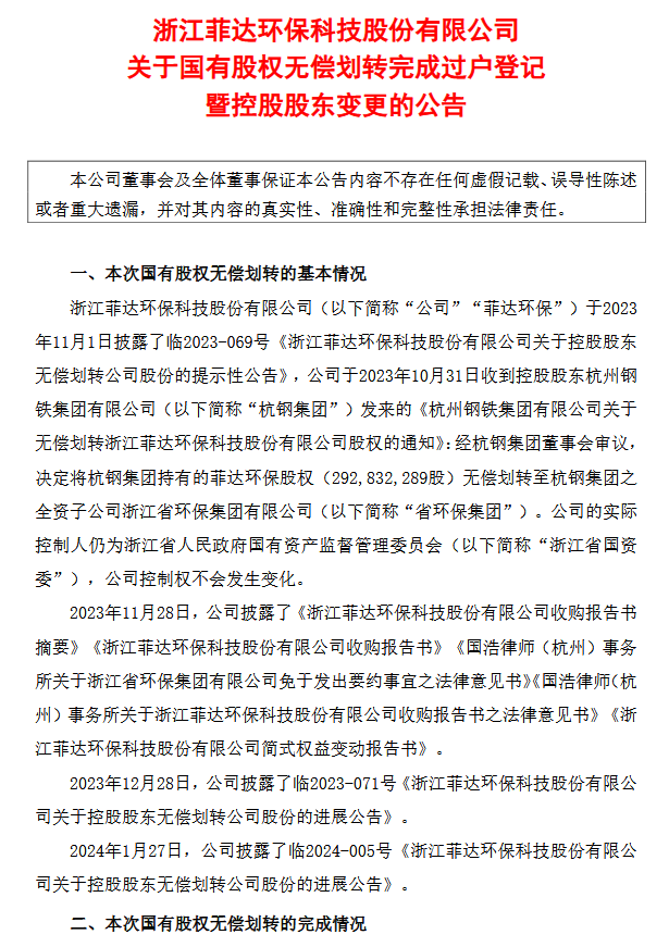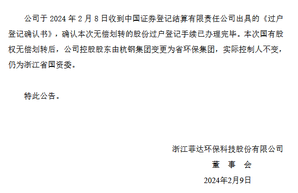菲達(dá)環(huán)保發(fā)布公告稱,2024年2月8日收到中國證券登記結(jié)算有限責(zé)任公司出具的《過戶登記確認(rèn)書》,確認(rèn)本次無償劃轉(zhuǎn)的股份過戶登記手續(xù)已辦理完畢。