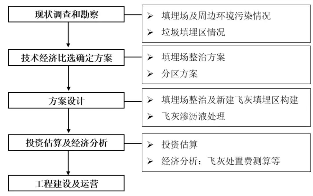 根據(jù)住房城鄉(xiāng)建設(shè)部發(fā)布的《2022年中國(guó)城市建設(shè)狀況公報(bào)》,截至2022年底,全國(guó)城市生活垃圾焚燒處理能力已達(dá) 80.46萬(wàn)噸/日,占比為72.53%。我國(guó)生活垃圾焚燒爐型主要為機(jī)械爐排爐和循環(huán)流化床,其中機(jī)械爐排爐飛灰產(chǎn)率一般為2%~5%,循環(huán)流化床飛灰產(chǎn)率一般為8%~15%。飛灰產(chǎn)率按3%~5%計(jì)算,則年產(chǎn)飛灰量約為881萬(wàn)~1468萬(wàn)噸。由于含有較高浸出濃度的重金屬和高毒性當(dāng)量的二噁英等有毒有害物質(zhì),生活垃圾焚燒飛灰被列入《國(guó)家危險(xiǎn)廢物名錄》。根據(jù)《2022年生態(tài)環(huán)境公報(bào)》,2022年工業(yè)危險(xiǎn)廢物產(chǎn)生量為9514.8萬(wàn)噸,飛灰占比約為9.2%~15.4%,飛灰產(chǎn)量較大。飛灰的妥善處置關(guān)系到生活垃圾焚燒廠的穩(wěn)定運(yùn)行,也是生活垃圾焚燒行業(yè)的難題和短板。目前,飛灰處置方式包括進(jìn)入危險(xiǎn)廢物填埋場(chǎng)填埋處置、固化/穩(wěn)定化處理后進(jìn)入生活垃圾填埋場(chǎng)填埋處置、水洗預(yù)處理后水泥窯協(xié)同處置、高溫熔融/玻璃化、高溫?zé)Y(jié)等,其中,固化/穩(wěn)定化處理后進(jìn)入生活垃圾填埋場(chǎng)填埋處置由于技術(shù)成熟且成本較低,是當(dāng)前飛灰處置的主流技術(shù)。填埋場(chǎng)分區(qū)改造建設(shè)必要性對(duì)于新建填埋場(chǎng)選址困難或飛灰產(chǎn)量較小的地區(qū),對(duì)現(xiàn)有生活垃圾填埋場(chǎng)進(jìn)行分區(qū)改造以滿足固化/穩(wěn)定化飛灰填埋要求是較為經(jīng)濟(jì)可行的方式。隨著生活垃圾焚燒發(fā)電廠的建成,現(xiàn)有生活垃圾填埋場(chǎng)將停止接收生活垃圾,若現(xiàn)有生活垃圾填埋場(chǎng)尚有可利用的剩余庫(kù)容,對(duì)其進(jìn)行分區(qū)改造,既可以充分發(fā)揮其稀缺資源作用,又可以解決生活垃圾焚燒廠的飛灰處置和大修期內(nèi)生活垃圾應(yīng)急處置問題,同時(shí)還可以完善生活垃圾填埋場(chǎng)的現(xiàn)有設(shè)施并治理現(xiàn)存污染,可謂一舉多得。因此,分區(qū)改造項(xiàng)目的建設(shè)十分必要且具有意義。總的來(lái)說(shuō),項(xiàng)目的建設(shè)具有較好的經(jīng)濟(jì)、環(huán)保和社會(huì)效益,具體體現(xiàn)在:經(jīng)濟(jì)效益:固化/穩(wěn)定化飛灰填埋收益可部分覆蓋現(xiàn)有生活垃圾填埋場(chǎng)治理投資;環(huán)保效益:現(xiàn)有生活垃圾填埋場(chǎng)污染問題得到改善、飛灰得到妥善處置;社會(huì)效益:填埋場(chǎng)原址改造,避免了新選址帶來(lái)的占用土地資源、搬遷、新的環(huán)境影響源等問題。如前所述,生活垃圾填埋場(chǎng)分區(qū)改造具有填埋場(chǎng)治理及飛灰入場(chǎng)填埋的雙重屬性,因此,其建設(shè)流程可以參考生活垃圾衛(wèi)生填埋場(chǎng)封場(chǎng)治理、擴(kuò)建,并結(jié)合項(xiàng)目的實(shí)際情況及當(dāng)?shù)叵嚓P(guān)主管部門的要求進(jìn)行,從建設(shè)方案角度,推薦建設(shè)流程如下圖所示: