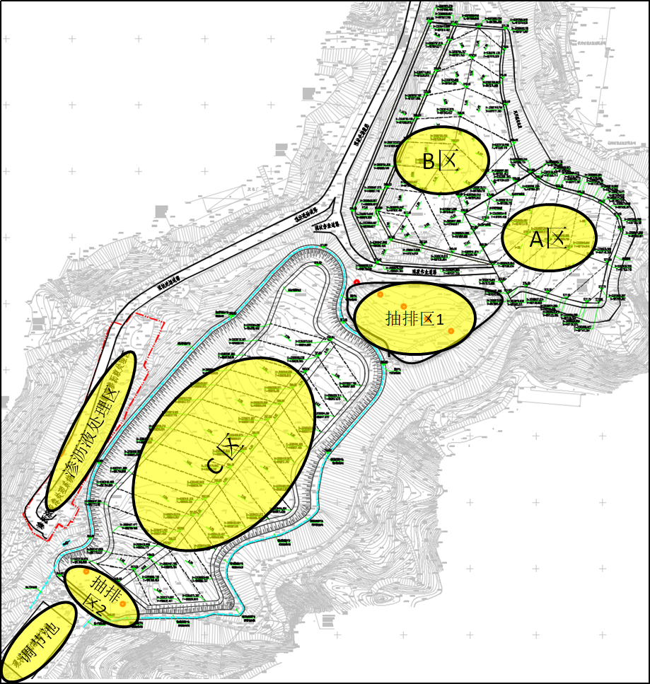 根據(jù)項(xiàng)目的實(shí)際情況,本項(xiàng)目采用分區(qū)建設(shè)、分區(qū)運(yùn)行的方案,分區(qū)方案詳見圖4。本項(xiàng)目由庫(kù)區(qū)中部的進(jìn)場(chǎng)道路分隔成兩個(gè)大的區(qū)域,遠(yuǎn)離調(diào)節(jié)池的為上游填埋區(qū)、靠近調(diào)節(jié)池的為下游填埋區(qū),其中,上游填埋區(qū)根據(jù)生活垃圾填埋情況、垃圾堆體液位及承載力情況,分為A、B區(qū)。本項(xiàng)目首先實(shí)施條件最好的A區(qū),再依次實(shí)施B、C區(qū)。在庫(kù)區(qū)中部和壩前設(shè)置了兩個(gè)抽排區(qū),通過(guò)新增降水井對(duì)生活垃圾滲瀝液進(jìn)行抽排,以控制和觀測(cè)垃圾堆體液位,保障填埋場(chǎng)的安全運(yùn)行。