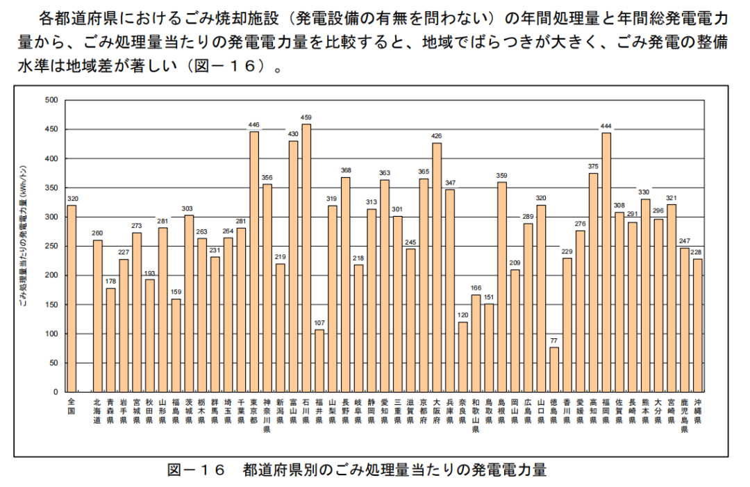 而2021年的日本二噁英污染清單顯示,火葬場的二噁英排放為3.6克TEQ,占比3.6%。同時(shí),根據(jù)日本環(huán)境省公開的2021年垃圾焚燒量和二噁英排放量數(shù)據(jù),可以得出日本2021年垃圾焚燒的每噸二噁英排放因子,為1.235微克每噸。我國2020年,爐排爐二噁英排放因子為0.1206微克每噸,日本垃圾焚燒項(xiàng)目的平均垃圾二噁英排放因子,為我國爐排爐十倍,加權(quán)平均因子的8倍。(我國排放因子數(shù)據(jù),來自清華大學(xué)劉建國教授論文《National and provincial dioxin emissions from municipal solid waste incineration in China》) 垃圾焚燒廠中,大部分僅為余熱利用,少部分為余熱發(fā)電70.9%的垃圾焚燒設(shè)施(共729個(gè))實(shí)施了余熱利用。余熱利用的具體方式包括給溫泉、溫水游泳池和周邊居民供熱等。有396個(gè)垃圾焚燒設(shè)施配備了發(fā)電設(shè)備,占所有設(shè)施的38.5%。這些發(fā)電設(shè)施的裝機(jī)總量,為2149MW。總發(fā)電量為10452GWh,發(fā)電效率的平均值為14.22%。垃圾焚燒設(shè)施的平均發(fā)電量,約為320 kWh/噸。各都道府縣的垃圾焚燒發(fā)電廠,發(fā)電量出現(xiàn)明顯巨大差異。從趨勢上看,日本的垃圾焚燒,噸發(fā)電量水平,略弱于我國現(xiàn)有情況。