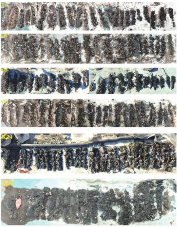 為制定陳腐垃圾綜合利用方案,2021 年對填埋場進行場地調查。在填埋堆體上布設了 6 個采樣點位(K11、K15、K18、K19、K24、K25),根據采樣孔垃圾分層情況,每層采集 3 個樣品制成 1 個混合樣,保證每個點位 3 個混合樣,垃圾樣品按 10% 的比例采集現場平行樣,共采集垃圾混合樣品 18 個。帶回實驗室后,每個點位的垃圾樣品制成 1 個最終混合樣。垃圾物理指標:容重、含水率、物理組成,垃圾樣品化學檢測檢測指標:pH值、有機質、TN、TP、總鉀、重金屬(Cu、Zn、Pb、Hg、Cr、As、Cd)。