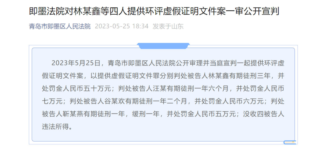 “十四五”以來,生態(tài)環(huán)境部會同最高法、最高檢、公安部、市場監(jiān)管總局一起,連續(xù)四年針對第三方環(huán)保服務(wù)機(jī)構(gòu)造假的問題開展了專項整治。同時,環(huán)境部還采用“四不兩直”檢查、監(jiān)督幫扶、大數(shù)據(jù)監(jiān)管,乃至中央生態(tài)環(huán)境保護(hù)督察等有效手段來打擊第三方環(huán)保服務(wù)機(jī)構(gòu)造假行為,取得了很好的效果。這三年,環(huán)境部查處了2260家有違法行為的第三方環(huán)保服務(wù)機(jī)構(gòu),向有關(guān)部門移送了193起案件進(jìn)行刑事立案,還公開曝光了457個典型案例。另外,他們還查處了企業(yè)在環(huán)境自行監(jiān)測方面的造假案件4255件,向有關(guān)部門移送了930起涉嫌違法犯罪的案件。這些案件當(dāng)中,包括去年在社會上影響比較大的山東錦華公司的環(huán)評造假案、江西展航公司的環(huán)評造假案、廣東廣禾公司的機(jī)動車檢測造假案等,這些案件都已經(jīng)宣判,并且產(chǎn)生了很好的社會效果,起到了震懾和警示作用。第二,推動了行刑銜接,提升了監(jiān)管執(zhí)法效能。環(huán)境部和最高檢、公安部一起構(gòu)建了行刑銜接、一體化推進(jìn)的聯(lián)動執(zhí)法機(jī)制,形成了共同會商、共同掛牌督辦、共同公布典型案件以及共同部署相關(guān)工作的“組合拳”,有效地提升了我們的監(jiān)管執(zhí)法效能。以前面提到過的“山東錦華公司造假案”為例,環(huán)評公司利用掛靠、偽造他人簽名的方式充當(dāng)虛假環(huán)評文件的制造者,這些年偽造虛假的環(huán)境影響報告書48份、環(huán)境影響報告表879份,數(shù)目巨大、性質(zhì)惡劣。▼“山東錦華環(huán)評造假案”宣判。圖片來源:青島市即墨區(qū)人民法院