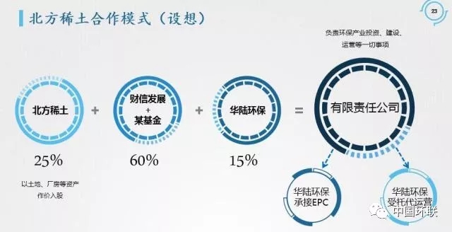 以北方稀土環(huán)保治理為例來分析,2018年新增的環(huán)保需求為:2000方/天氯化銨廢水處理零排放項目、約10萬噸/年的低放射性固體廢棄物處置、約4000噸/年的普通固體廢棄物處置,預(yù)計總投資額達1個億。目前,北方稀土環(huán)保產(chǎn)業(yè)已投入6.7億,每年運營費用5000萬,環(huán)保企業(yè)參差不齊,達產(chǎn)效果僅達40%。針對北方稀土的環(huán)保需求,華陸環(huán)保提出了基于環(huán)?!傲恪蓖顿Y的合作模式。