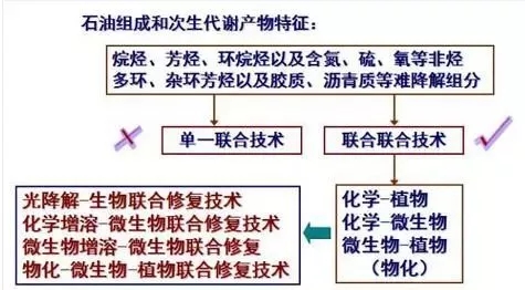 石油是烷烴、芳烴、環(huán)烷烴及含氮、硫、氧等非烴類組分的混合物,其中多環(huán)、雜環(huán)芳烴以及膠質(zhì)、瀝青質(zhì)等組分生物降解性較差。石油及次生代謝產(chǎn)的組成特征決定了修復的難度和復雜性。因此,單一聯(lián)合技術不能很好的解決污染問題時,需要考慮聯(lián)合使用各種處理技術。