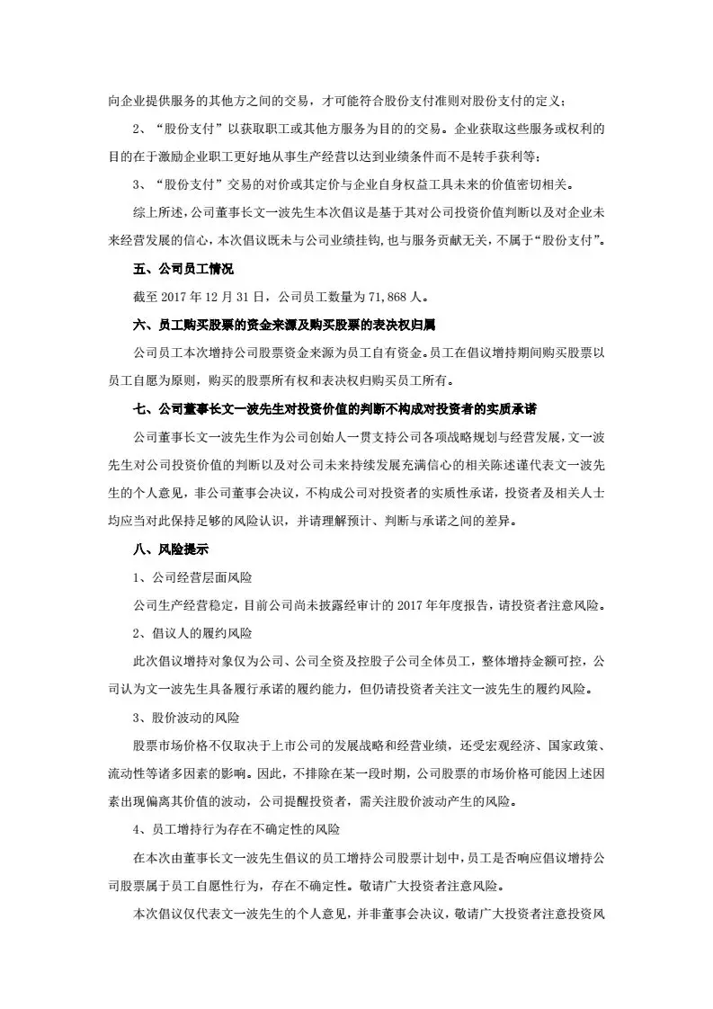 二、補(bǔ)償不設(shè)上限?!岸麻L(zhǎng)文一波先生將以自有資金現(xiàn)金形式對(duì)員工因增持公司股票并持續(xù)持有而產(chǎn)生的虧損予以全額補(bǔ)償,資金來(lái)源為自有資金,補(bǔ)償金額不存在最高金額限制?!睋Q句話說(shuō)就是,虧多少,補(bǔ)多少,你虧,董事長(zhǎng)補(bǔ)!