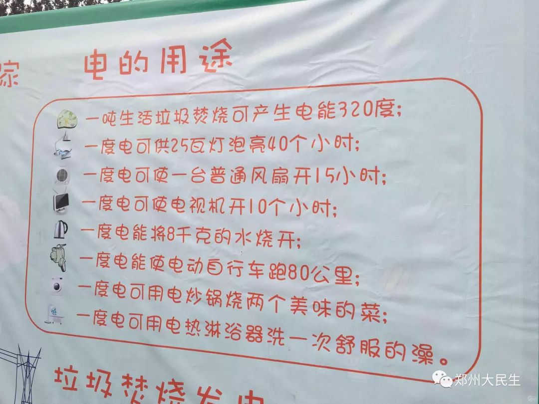 一噸生活垃圾焚燒可產生電能320度;一度電可供25瓦燈泡亮40個小時;一度電可使一臺普通風扇開15小時;一度電能使電動自行車跑80公里;一度電可使電視機開10小時。